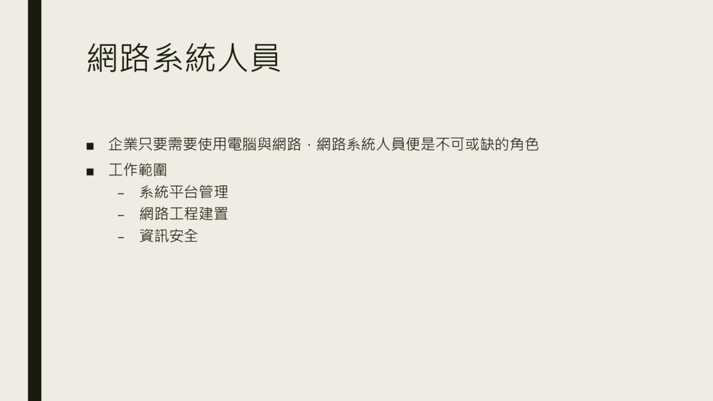 網路系統人員 ▪ 企業只要需要使用電腦與網路,網路系統人員便是不可或缺的角色 ▪ 工作範圍 – 系統平台管理 – 網路工程建置 –
