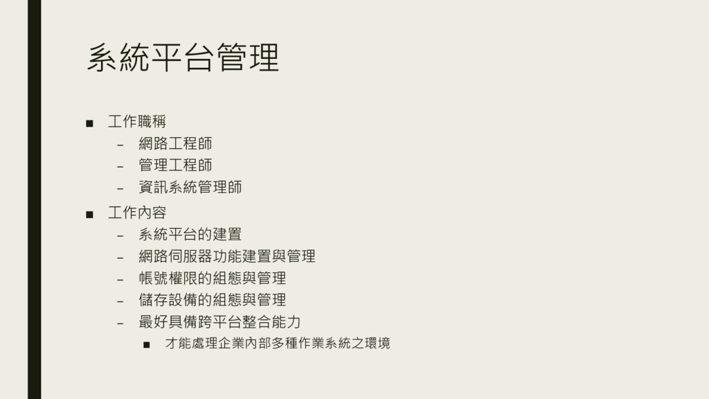 工作內容 – 系統平台的建置 – 網路伺服器功能建置與管理 – 帳號權限的組態與管理 – 儲存設備的組態與管理 – 最好具備跨平台整合能力 ▪ 才能處理企業內部多種作業系統之環境