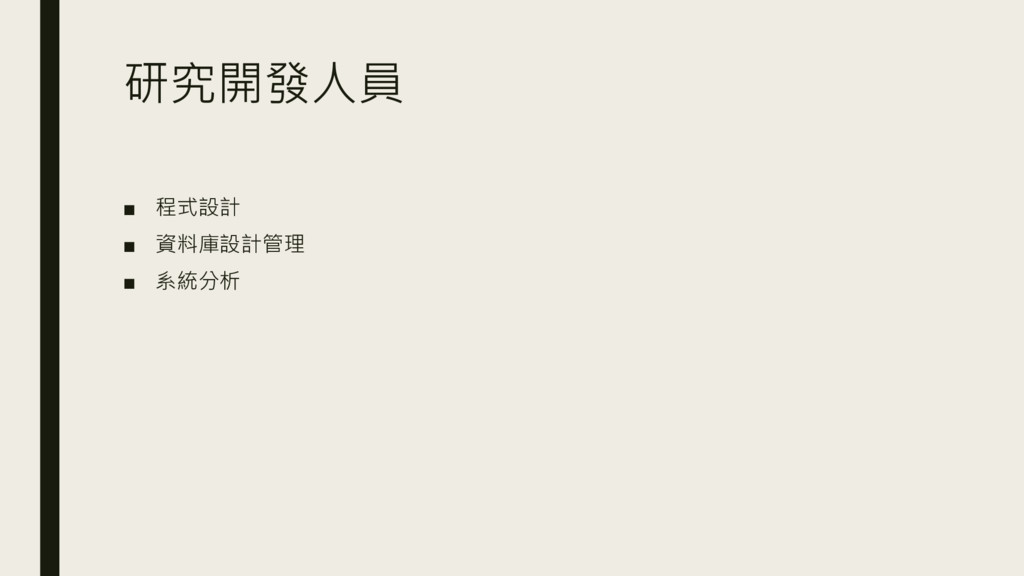 研究開發人員 ▪ 程式設計 ▪ 資料庫設計管理 ▪ 系統分析