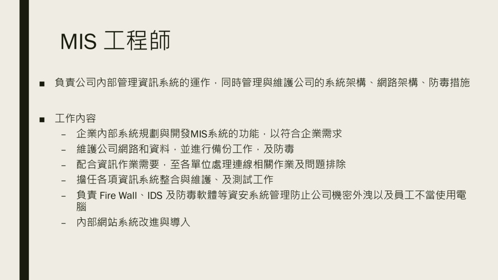 MIS 工程師 ▪ 負責公司內部管理資訊系統的運作,同時管理與維護公司的系統架構、網路架構、防毒措施 ▪ 工作內容 – 企業內部系統規劃與開發MIS系統的功能,以符合企業需求 – 維護公司網路和資料,並進行備份工作,及防毒
