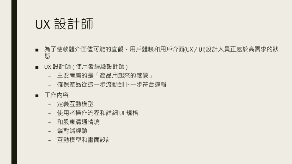 ( 使用者經驗設計師 ) – 主要考慮的是「產品用起來的感覺」 – 確保產品從這一步流動到下一步符合邏輯 ▪ 工作內容 – 定義互動模型 – 使用者操作流程和詳細 UI 規格 – 和股東溝通情境 – 端對端經驗 – 互動模型和畫面設計