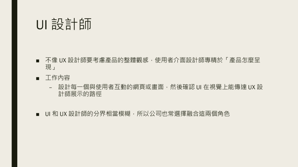 UI 設計師 ▪ 不像 UX 設計師要考慮產品的整體觀感,使用者介面設計師專精於「產品怎麼呈 現」 ▪ 工作內容 –
