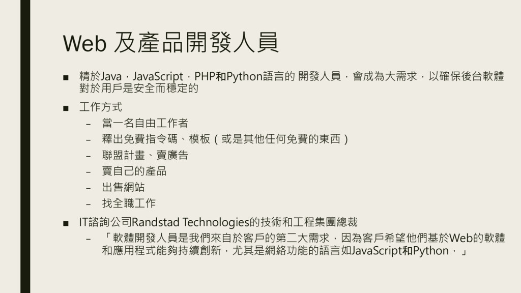 Web 及產品開發人員 ▪ 精於Java,JavaScript,PHP和Python語言的 開發人員,會成為大需求,以確保後台軟體 對於用戶是安全而穩定的 ▪ 工作方式 – 當一名自由工作者