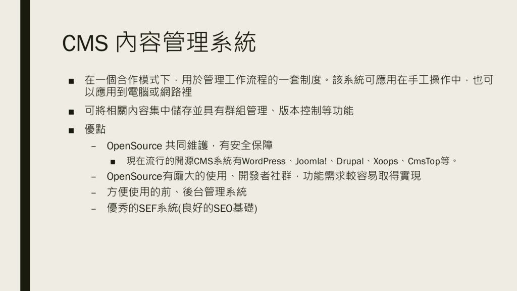 OpenSource 共同維護,有安全保障 ▪ 現在流行的開源CMS系統有WordPress、Joomla!、Drupal、Xoops、CmsTop等。 – OpenSource有龐大的使用、開發者社群,功能需求較容易取得實現 – 方便使用的前、後台管理系統 – 優秀的SEF系統(良好的SEO基礎)