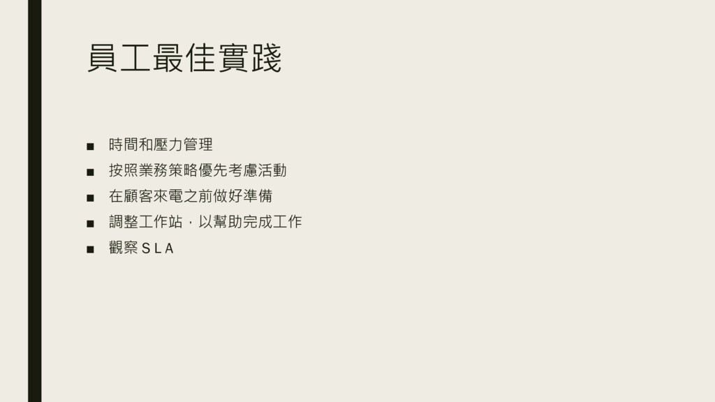 員工最佳實踐 ▪ 時間和壓力管理 ▪ 按照業務策略優先考慮活動 ▪ 在顧客來電之前做好準備 ▪ 調整工作站,以幫助完成工作 ▪