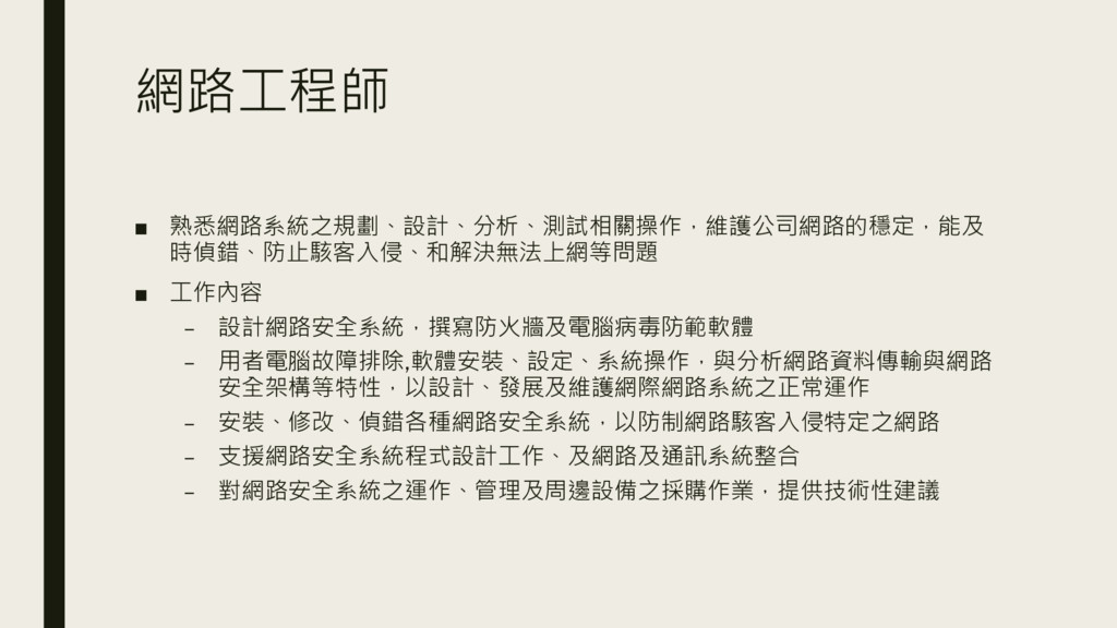 網路工程師 ▪ 熟悉網路系統之規劃、設計、分析、測試相關操作,維護公司網路的穩定,能及 時偵錯、防止駭客入侵、和解決無法上網等問題 ▪ 工作內容 – 設計網路安全系統,撰寫防火牆及電腦病毒防範軟體 – 用者電腦故障排除,軟體安裝、設定、系統操作,與分析網路資料傳輸與網路