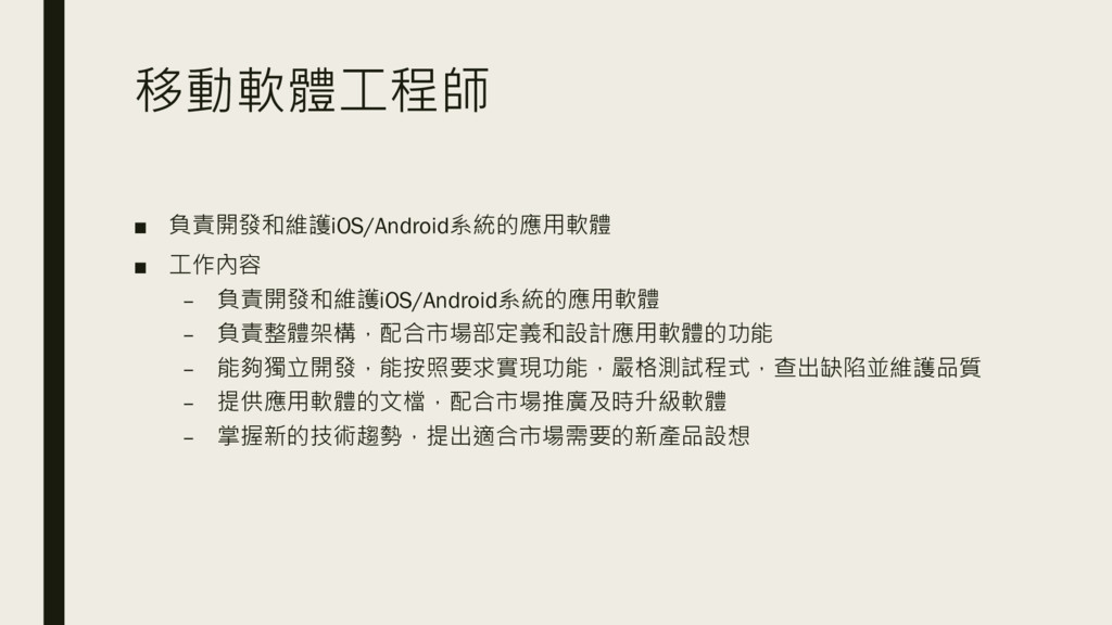 移動軟體工程師 ▪ 負責開發和維護iOS/Android系統的應用軟體 ▪ 工作內容 – 負責開發和維護iOS/Android系統的應用軟體 – 負責整體架構,配合市場部定義和設計應用軟體的功能 –