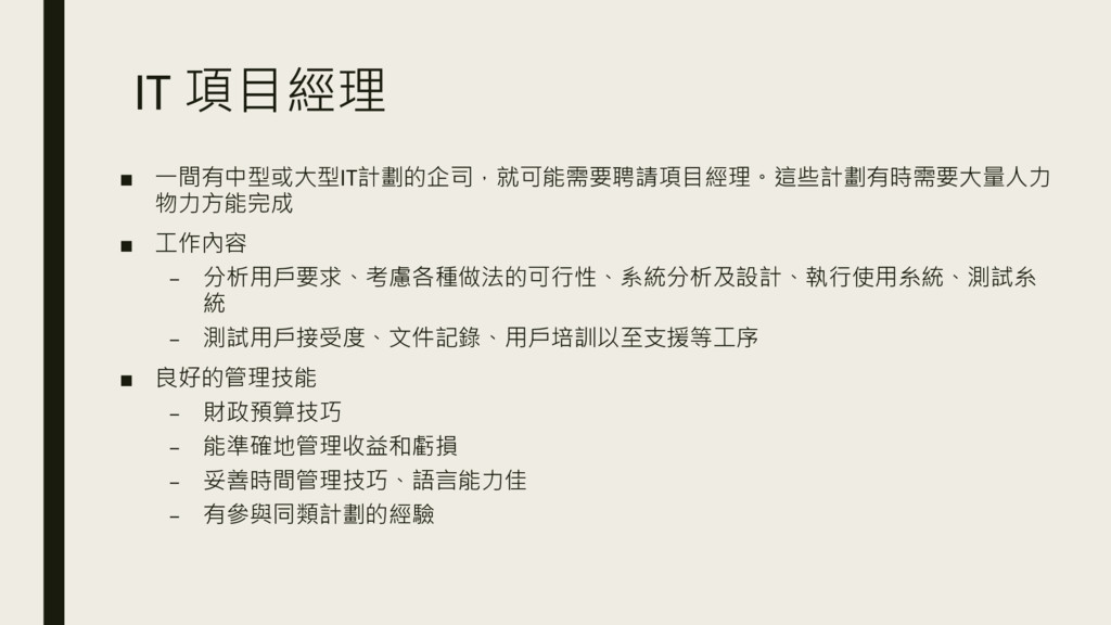 IT 項目經理 ▪ 一間有中型或大型IT計劃的企司,就可能需要聘請項目經理。這些計劃有時需要大量人力 物力方能完成 ▪ 工作內容 – 分析用戶要求、考慮各種做法的可行性、系統分析及設計、執行使用糸統、測試糸 統