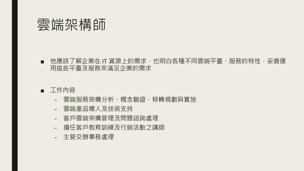 雲端架構師 ▪ 他應該了解企業在 IT 資源上的需求,也明白各種不同雲端平臺、服務的特性,妥善運 用這些平臺及服務來滿足企業的需求 ▪ 工作內容 – 雲端服務架構分析、概念驗證、移轉規劃與實施