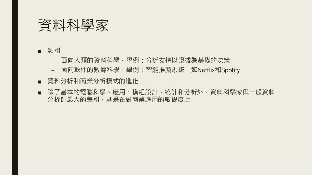資料科學家 ▪ 類別 – 面向人類的資料科學,舉例:分析支持以證據為基礎的決策 – 面向軟件的數據科學,舉例:智能推薦系統,如Netflix和Spotify ▪ 資料分析和商業分析模式的進化 ▪