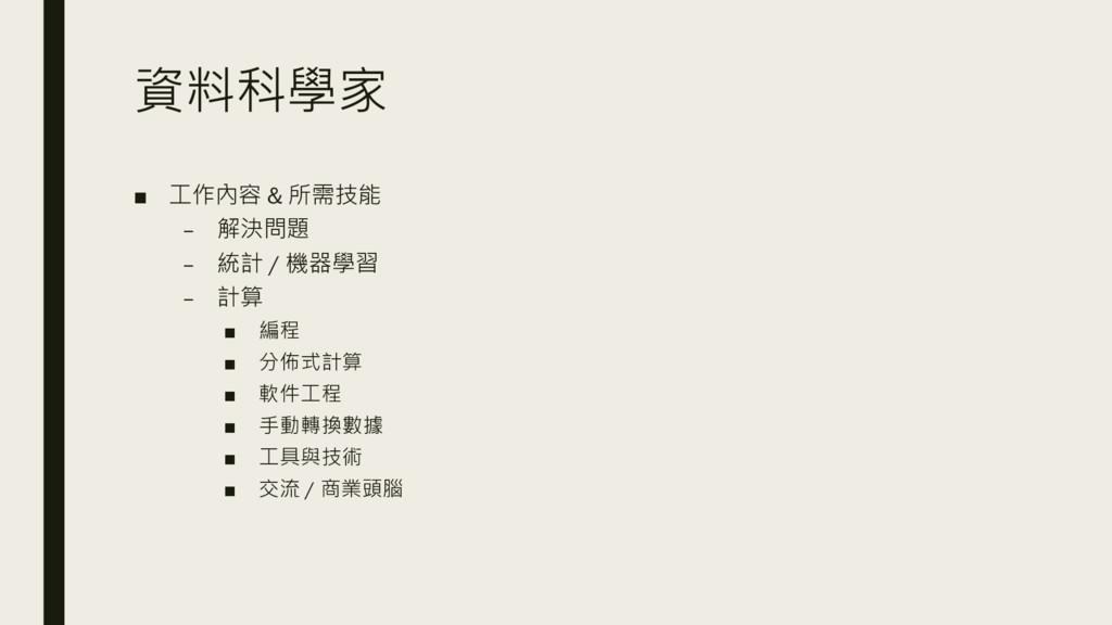 資料科學家 ▪ 工作內容 & 所需技能 – 解決問題 – 統計 /