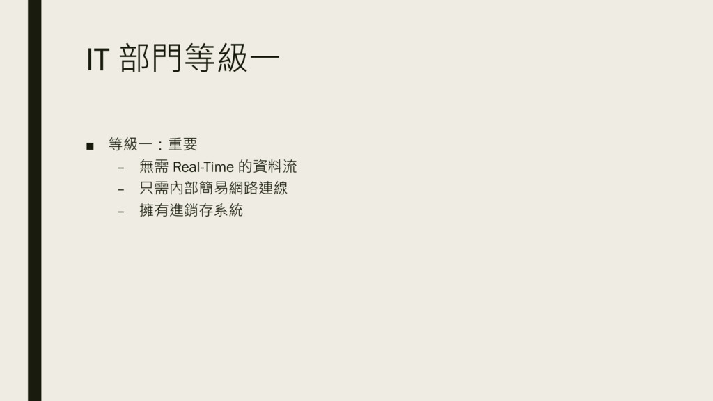 IT 部門等級一 ▪ 等級一:重要 – 無需 Real-Time 的資料流 – 只需內部簡易網路連線