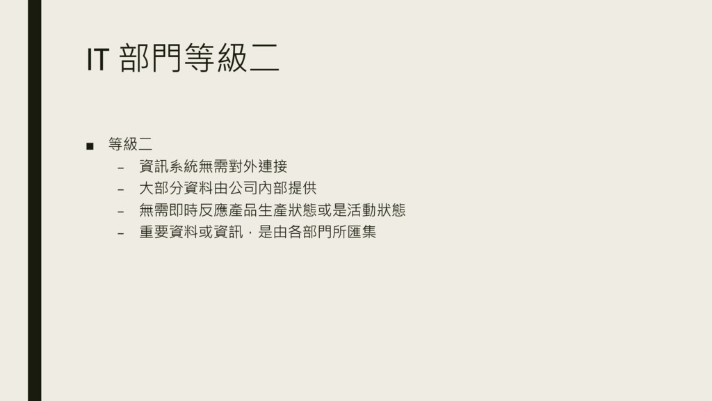 IT 部門等級二 ▪ 等級二 – 資訊系統無需對外連接 – 大部分資料由公司內部提供 – 無需即時反應產品生產狀態或是活動狀態