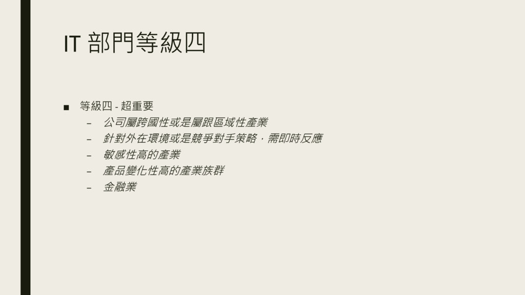 IT 部門等級四 ▪ 等級四 - 超重要 – 公司屬跨國性或是屬跟區域性產業 – 針對外在環境或是競爭對手策略,需即時反應