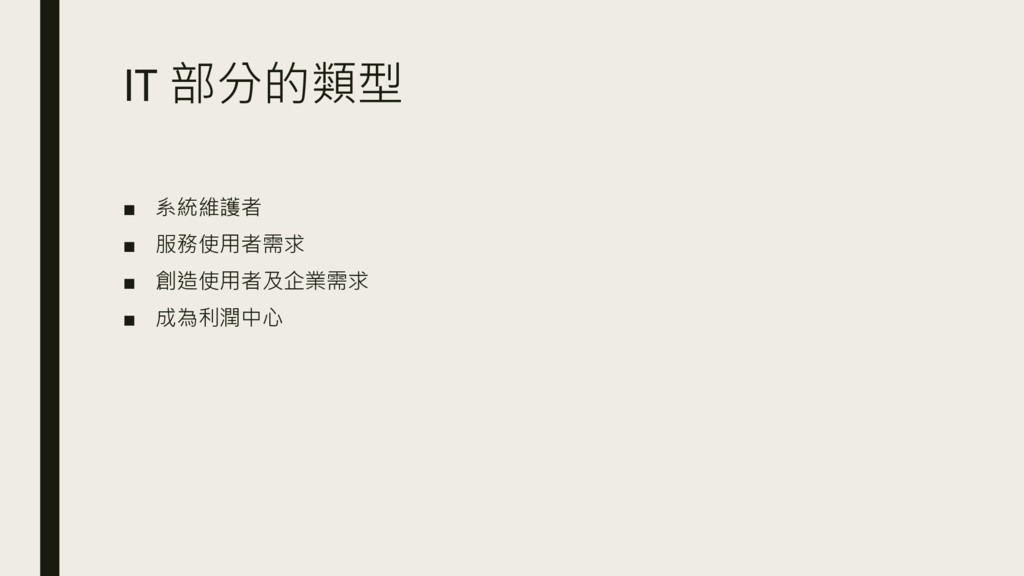 IT 部分的類型 ▪ 系統維護者 ▪ 服務使用者需求 ▪ 創造使用者及企業需求 ▪ 成為利潤中心