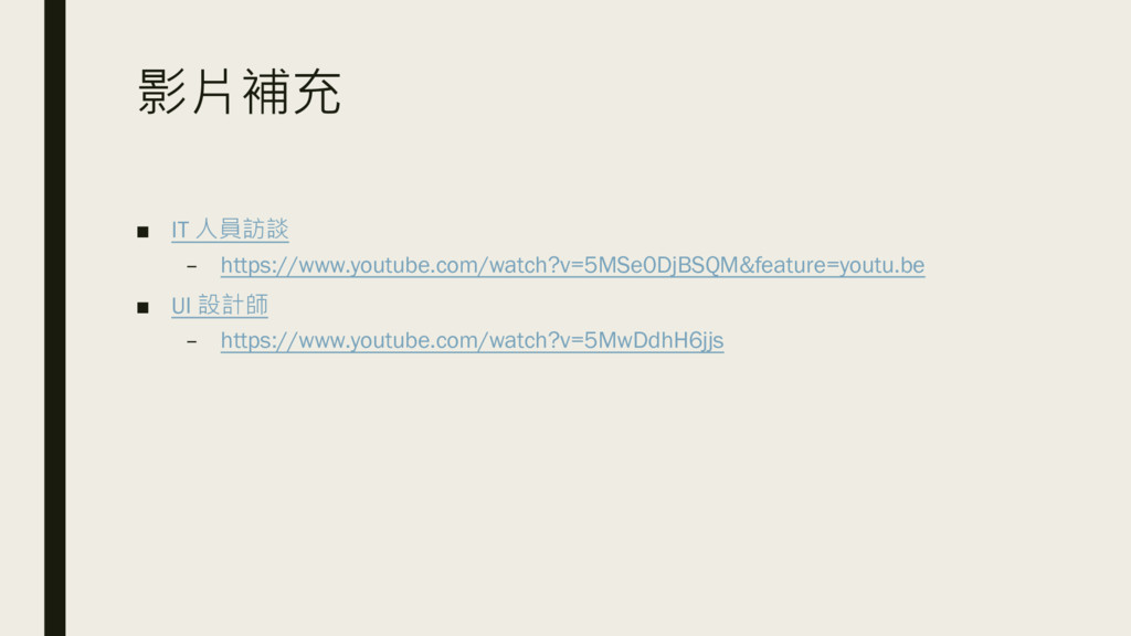 影片補充 ▪ IT 人員訪談 – https://www.youtube.com/watch?v=5MSe0DjBSQM&feature=youtu.be ▪ UI 設計師 –