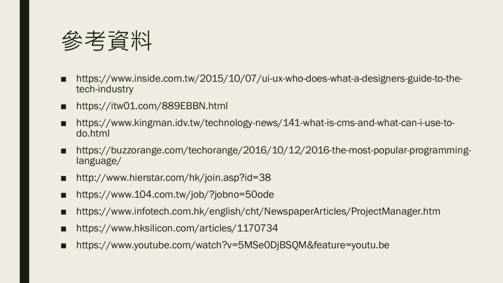 https://buzzorange.com/techorange/2016/10/12/2016-the-most-popular-programming- language/ ▪ http://www.hierstar.com/hk/join.asp?id=38 ▪ https://www.104.com.tw/job/?jobno=50ode ▪ https://www.infotech.com.hk/english/cht/NewspaperArticles/ProjectManager.htm ▪ https://www.hksilicon.com/articles/1170734 ▪ https://www.youtube.com/watch?v=5MSe0DjBSQM&feature=youtu.be