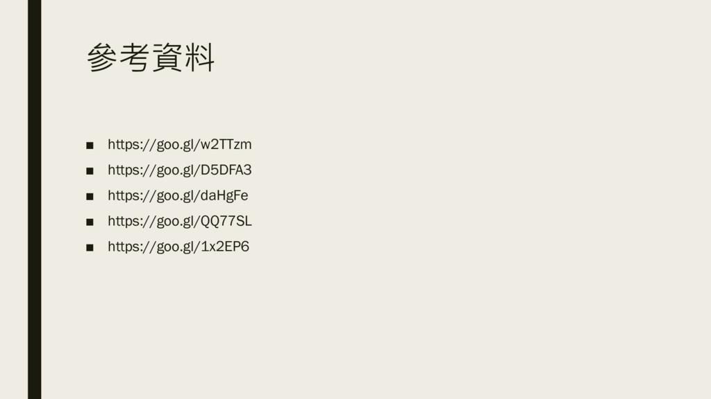 參考資料 ▪ https://goo.gl/w2TTzm ▪ https://goo.gl/D5DFA3 ▪ https://goo.gl/daHgFe ▪ https://goo.gl/QQ77SL ▪