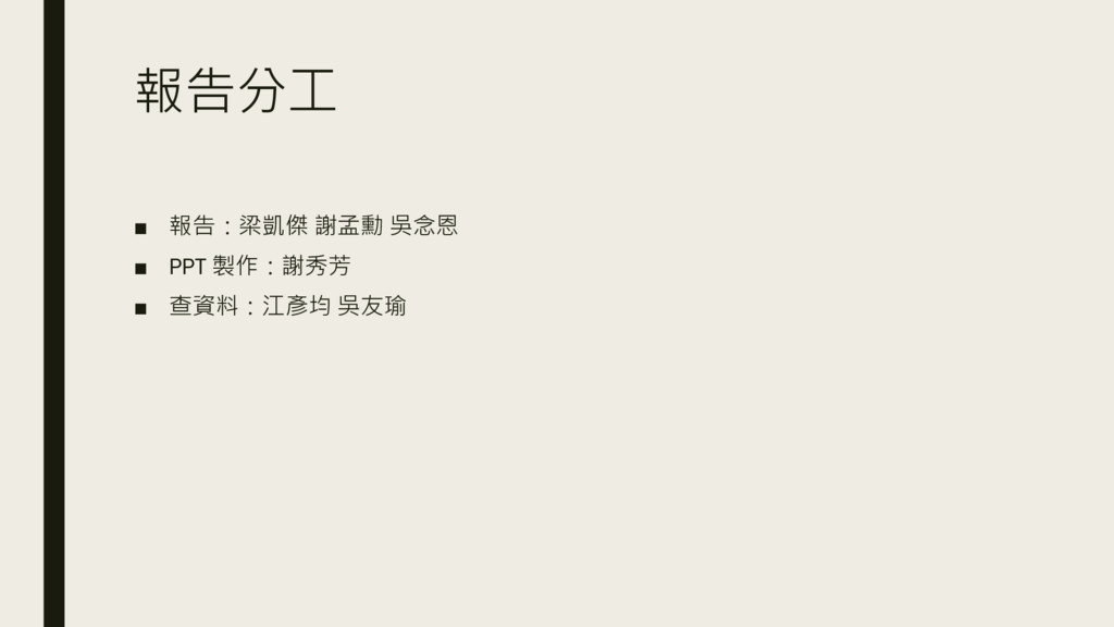 報告分工 ▪ 報告:梁凱傑 謝孟勳 吳念恩 ▪ PPT 製作:謝秀芳 ▪ 查資料:江彥均