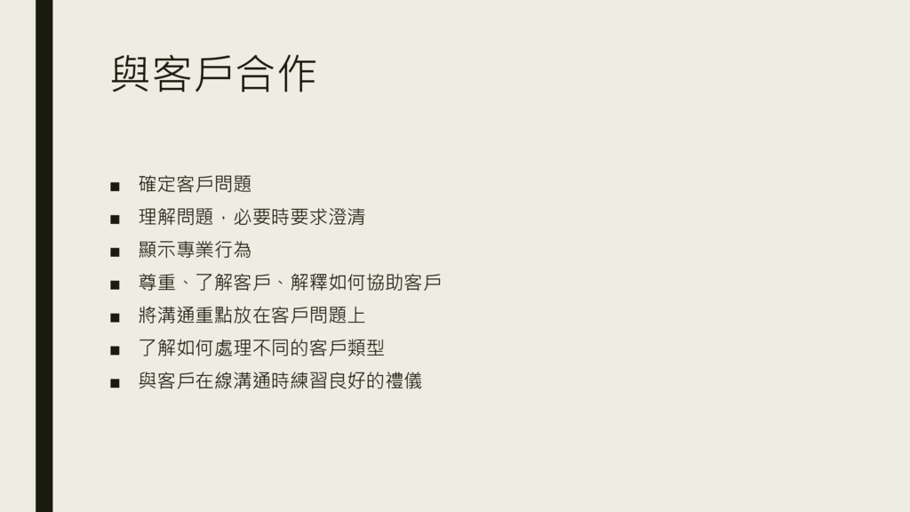 與客戶合作 ▪ 確定客戶問題 ▪ 理解問題,必要時要求澄清 ▪ 顯示專業行為 ▪ 尊重、了解客戶、解釋如何協助客戶 ▪