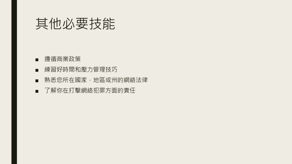 其他必要技能 ▪ 遵循商業政策 ▪ 練習好時間和壓力管理技巧 ▪ 熟悉您所在國家,地區或州的網絡法律 ▪ 了解你在打擊網絡犯罪方面的責任