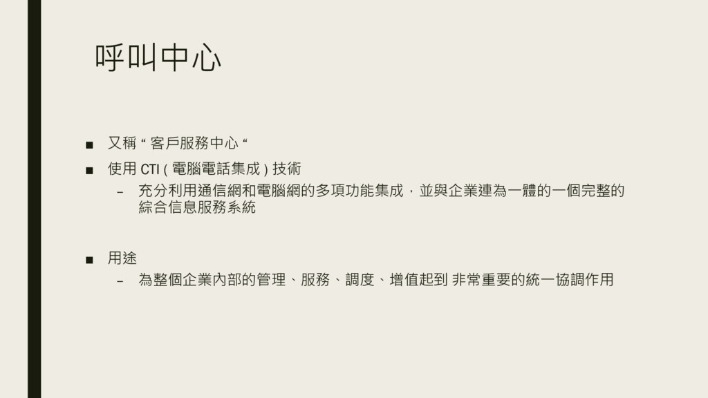 呼叫中心 ▪ 又稱 “ 客戶服務中心 “ ▪ 使用 CTI (