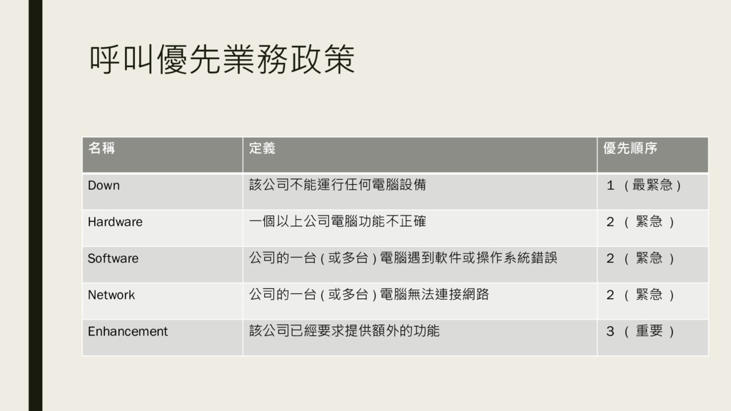 Hardware 一個以上公司電腦功能不正確 2 ( 緊急 ) Software 公司的一台 ( 或多台 ) 電腦遇到軟件或操作系統錯誤 2 ( 緊急 ) Network 公司的一台 ( 或多台 ) 電腦無法連接網路 2 ( 緊急 ) Enhancement 該公司已經要求提供額外的功能 3 ( 重要 )
