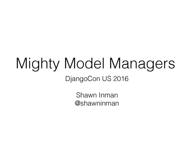 These slides accompany a talk I gave at DjangoCon US 2016 called "Mighty Model Managers". The abstract can be seen here: https://2016.djangocon.us/schedule/presentation/62/