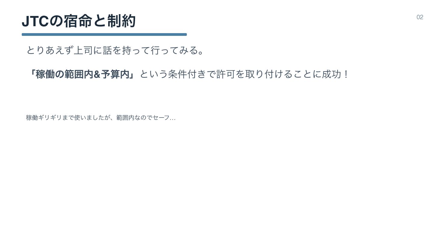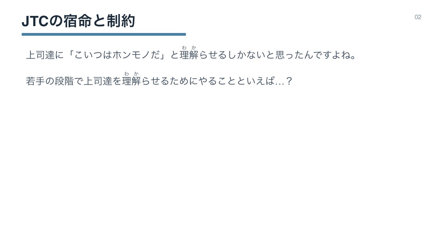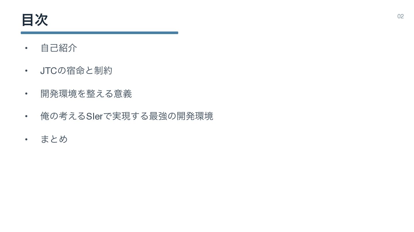 ࣍ 02 • ࣗݾհ • JTCͷ໋॓ͱ੍ • ։ൃڥΛ͑Δҙٛ • Զͷߟ͑ΔSIerͰ࣮ݱ͢Δ࠷ڧͷ։ൃڥ
