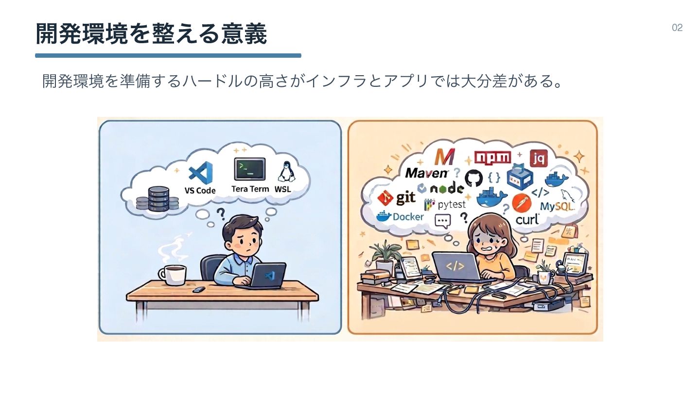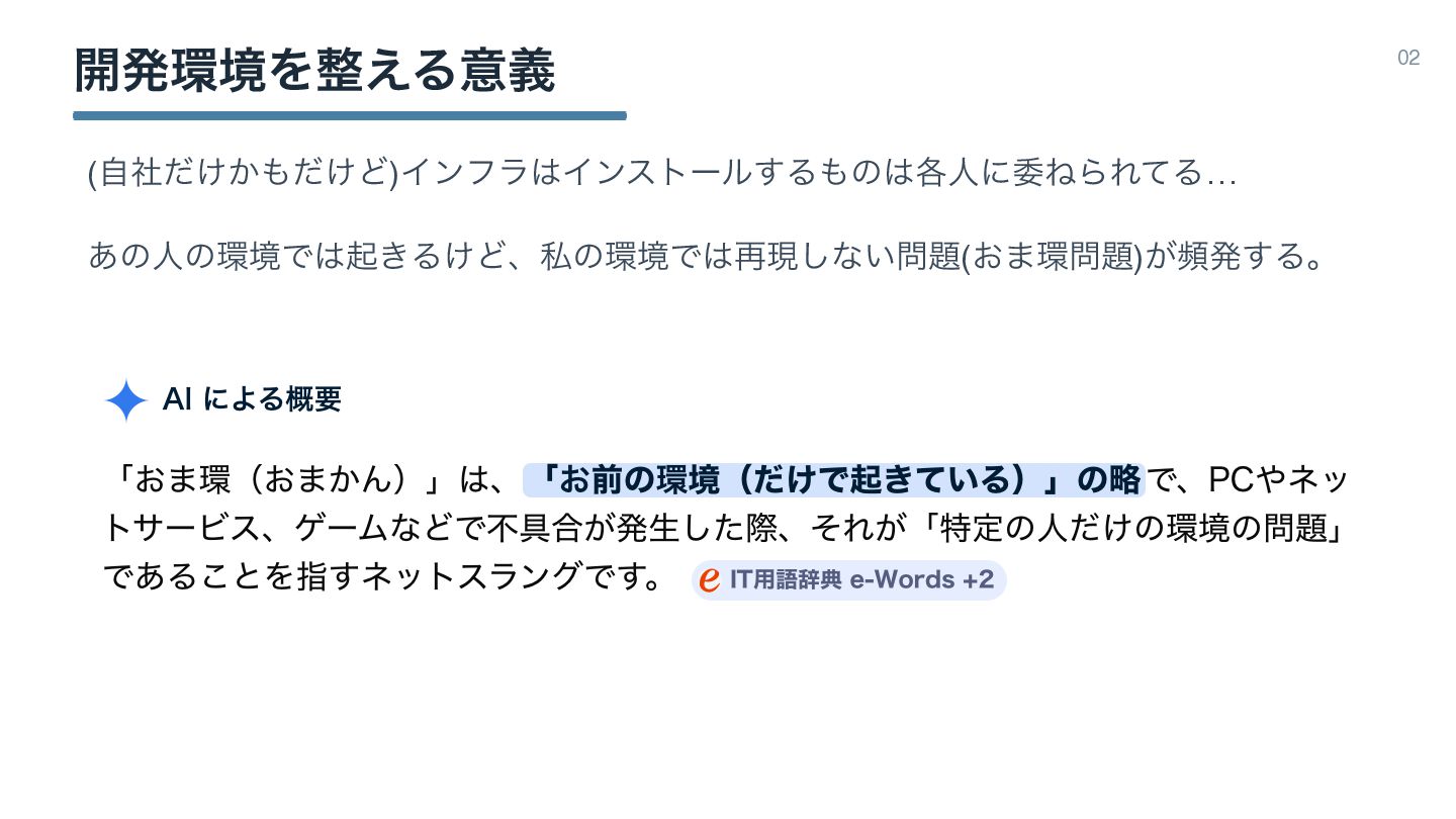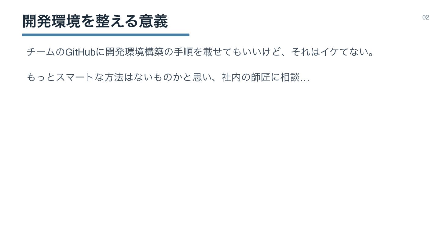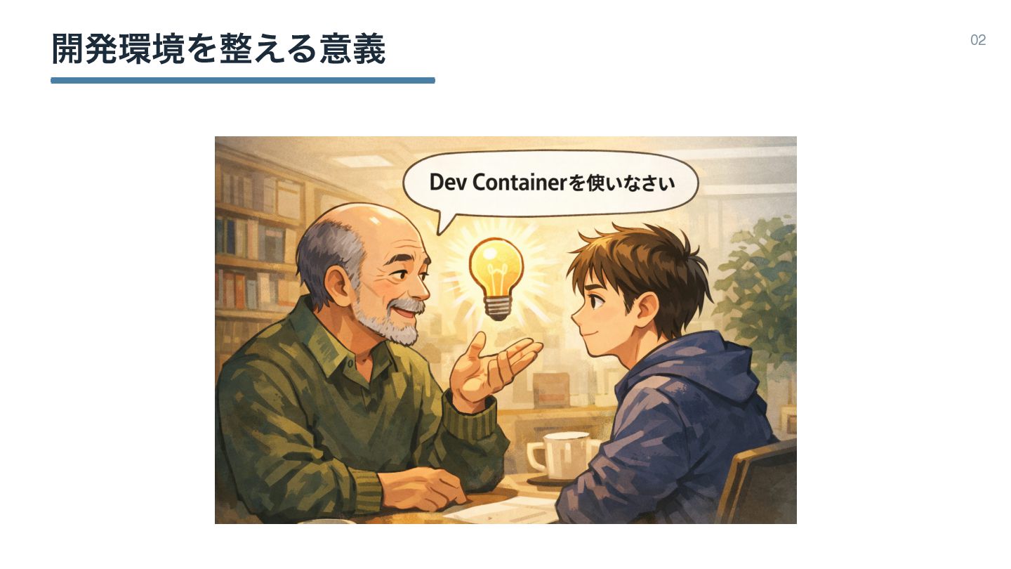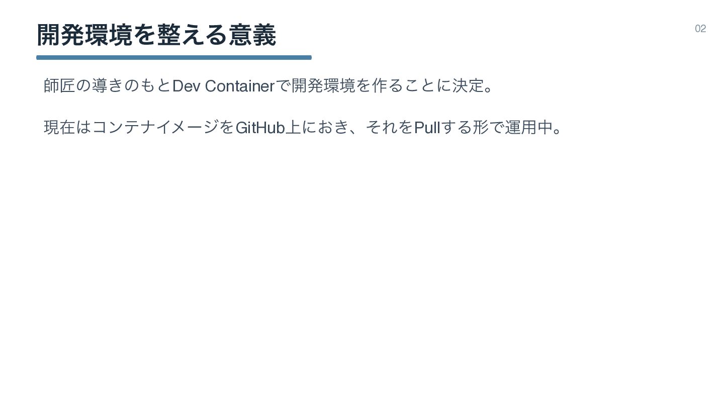 ։ൃڥΛ͑Δҙٛ 02 ࢣঊͷಋ͖ͷͱDev ContainerͰ։ൃڥΛ࡞Δ͜ͱʹܾఆɻ ݱࡏίϯςφΠϝʔδΛGitHub্ʹ͓͖ɺͦΕΛPull͢ΔܗͰӡ༻தɻ