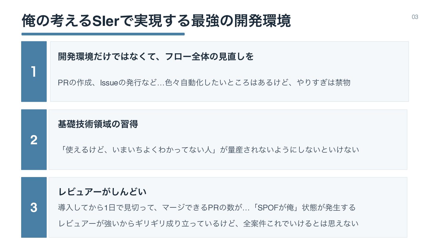 Զͷߟ͑ΔSIerͰ࣮ݱ͢Δ࠷ڧͷ։ൃڥ 03 1 ։ൃڥ͚ͩͰͳͯ͘ɺϑϩʔશମͷݟ͠Λ PRͷ࡞ɺIssueͷൃߦͳͲ…৭ʑࣗಈԽ͍ͨ͠ͱ͜Ζ͋Δ͚ͲɺΓ͗͢ې 2 جૅٕज़ྖҬͷशಘ ʮ͑Δ͚Ͳɺ͍·͍ͪΑ͘Θ͔ͬͯͳ͍ਓʯ͕ྔ࢈͞Εͳ͍Α͏ʹ͠ͳ͍ͱ͍͚ͳ͍ 3 ϨϏϡΞʔ͕͠ΜͲ͍