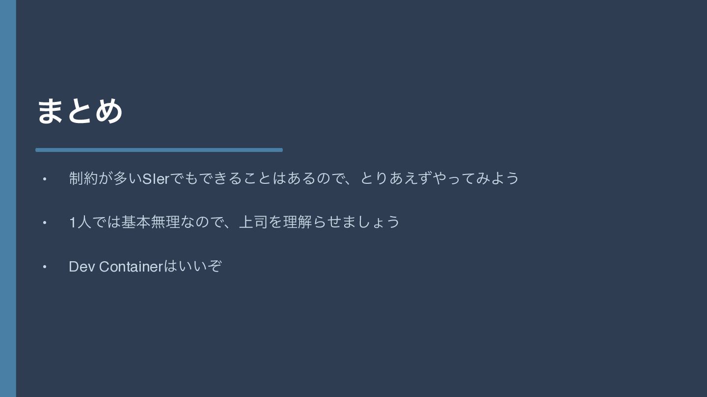 ·ͱΊ • ੍͕ଟ͍SIerͰͰ͖Δ͜ͱ͋ΔͷͰɺͱΓ͋͑ͣͬͯΈΑ͏ • 1ਓͰجຊແཧͳͷͰɺ্࢘ΛཧղΒͤ·͠ΐ͏ • Dev Container͍͍ͧ