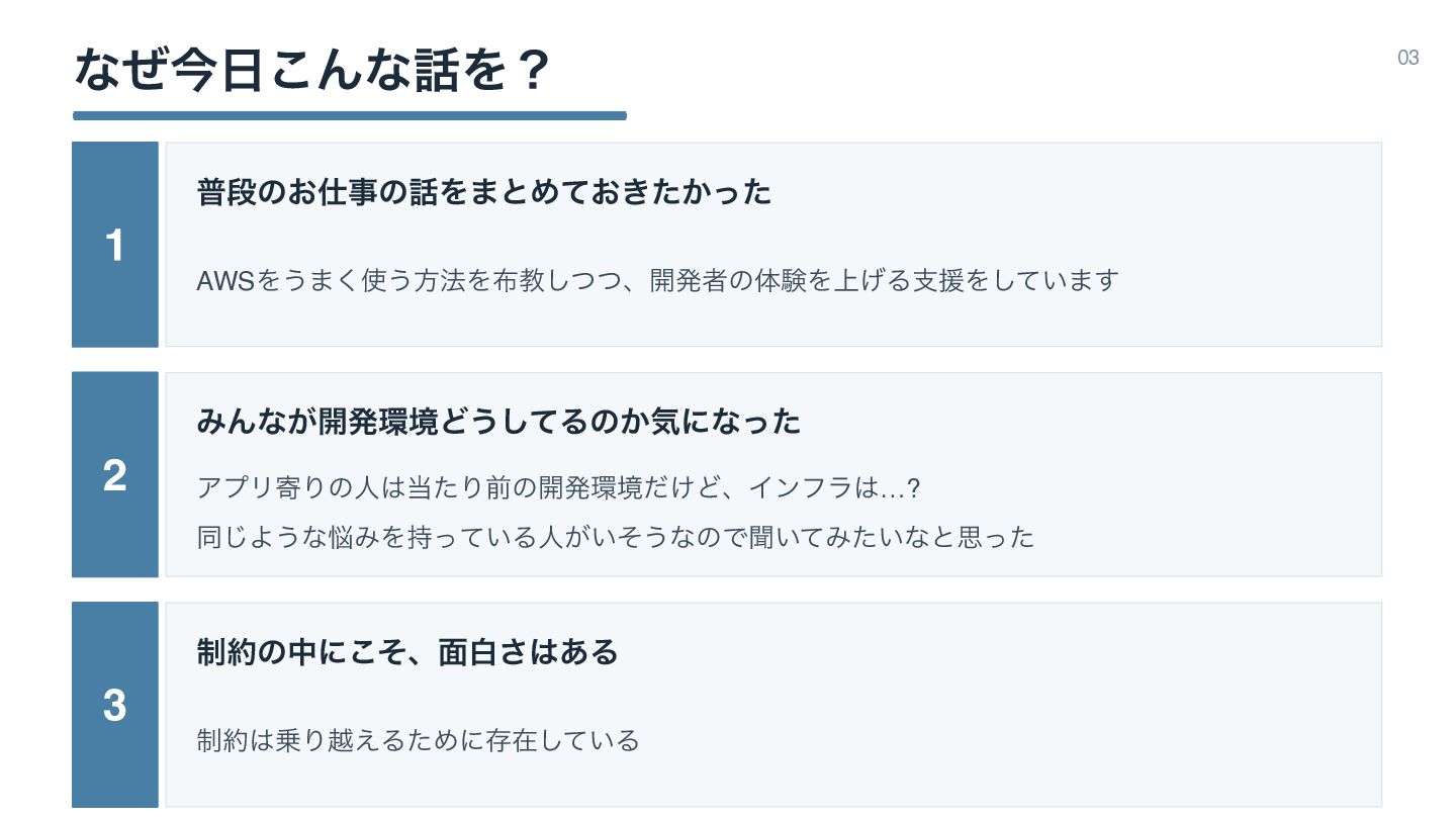 ͳͥࠓ͜ΜͳΛʁ 03 1 ීஈͷ͓ࣄͷΛ·ͱΊ͓͖͔ͯͨͬͨ AWSΛ͏·͘͏ํ๏Λڭͭͭ͠ɺ։ൃऀͷମݧΛ্͛ΔࢧԉΛ͍ͯ͠·͢ 2 ΈΜͳ͕։ൃڥͲ͏ͯ͠Δͷ͔ؾʹͳͬͨ ΞϓϦدΓͷਓͨΓલͷ։ൃڥ͚ͩͲɺΠϯϑϥ…? 3 ੍ͷதʹͦ͜ɺ໘ന͋͞Δ