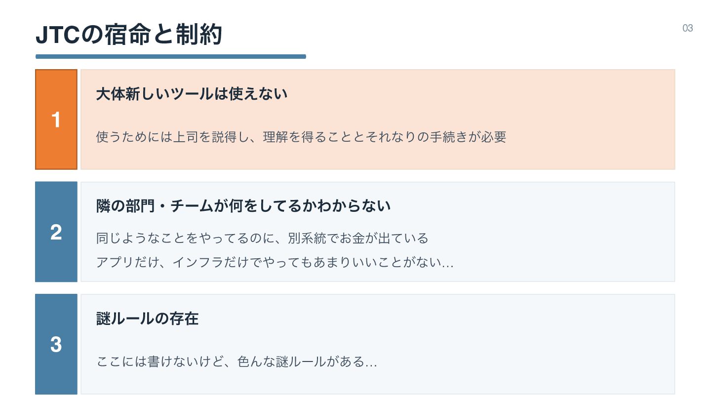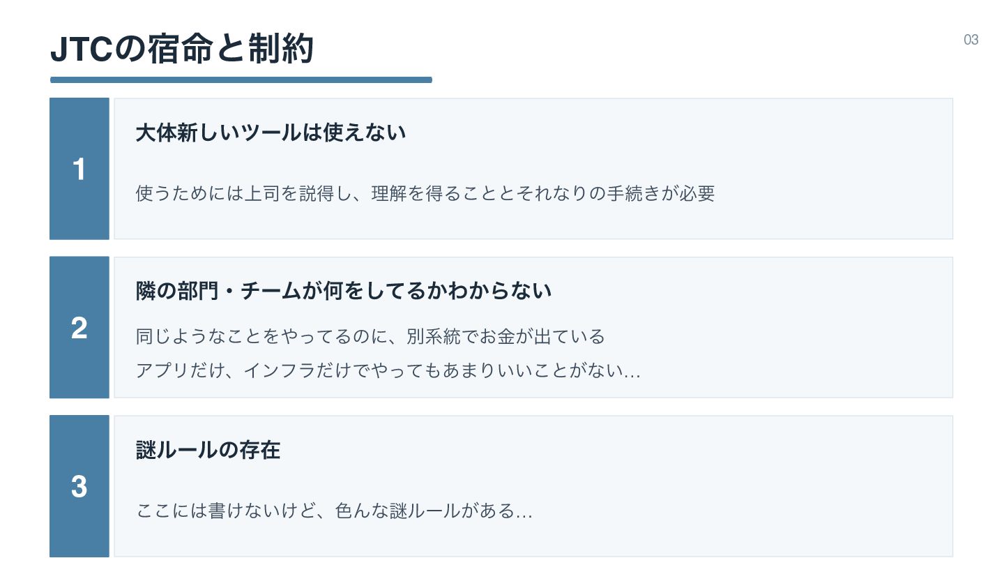 JTCͷ໋॓ͱ੍ 03 1 େମ৽͍͠πʔϧ͑ͳ͍ ͏ͨΊʹ্࢘Λઆಘ͠ɺཧղΛಘΔ͜ͱͱͦΕͳΓͷखଓ͖͕ඞཁ 2 ྡͷ෦ɾνʔϜ͕ԿΛͯ͠Δ͔Θ͔Βͳ͍ ಉ͡Α͏ͳ͜ͱΛͬͯΔͷʹɺผܥ౷Ͱ͓͕ۚग़͍ͯΔ 3 Ṗϧʔϧͷଘࡏ