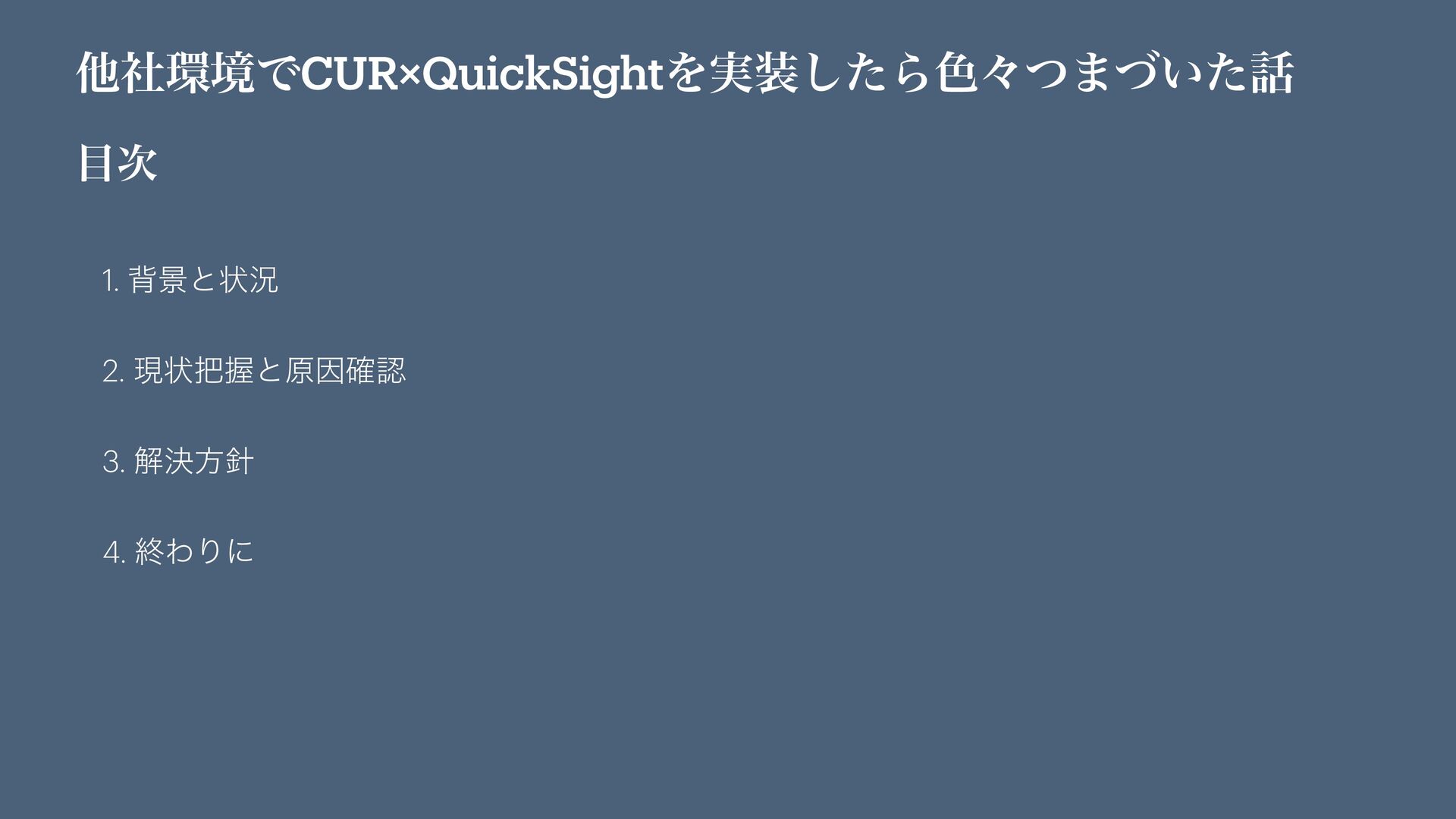 ଞࣾڥͰCUR×QuickSightΛ࣮ͨ͠Β৭ʑͭ·͍ͮͨ ࣍ 1. എܠͱঢ়گ 2. ݱঢ়ѲͱݪҼ֬ೝ 3. ղܾํ 4. ऴΘΓʹ