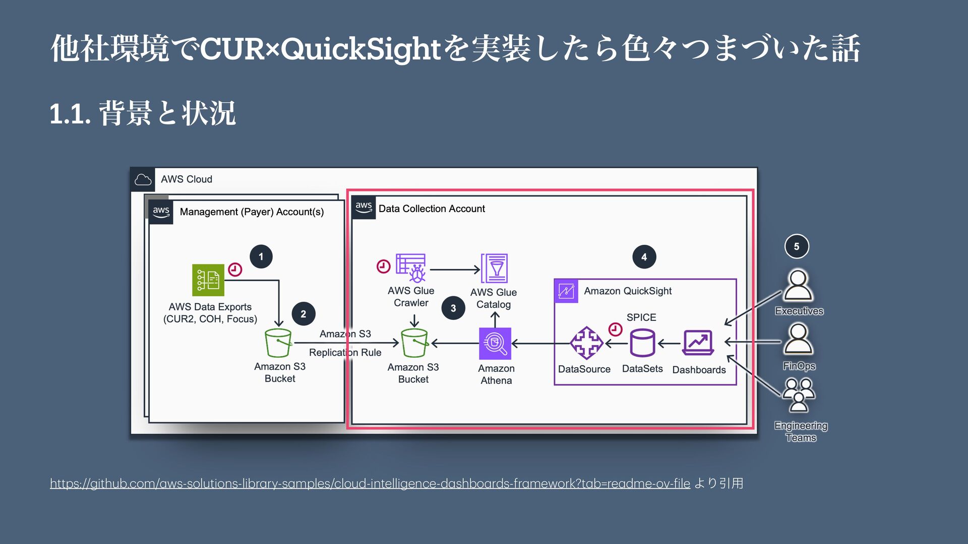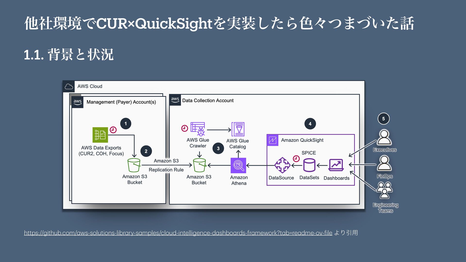 ଞࣾڥͰCUR×QuickSightΛ࣮ͨ͠Β৭ʑͭ·͍ͮͨ 1.1. എܠͱঢ়گ https://github.com/ a ws-solutions-libr a ry-s a mples/cloud-intelligence-d