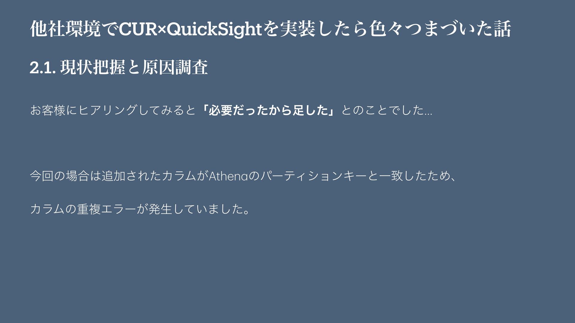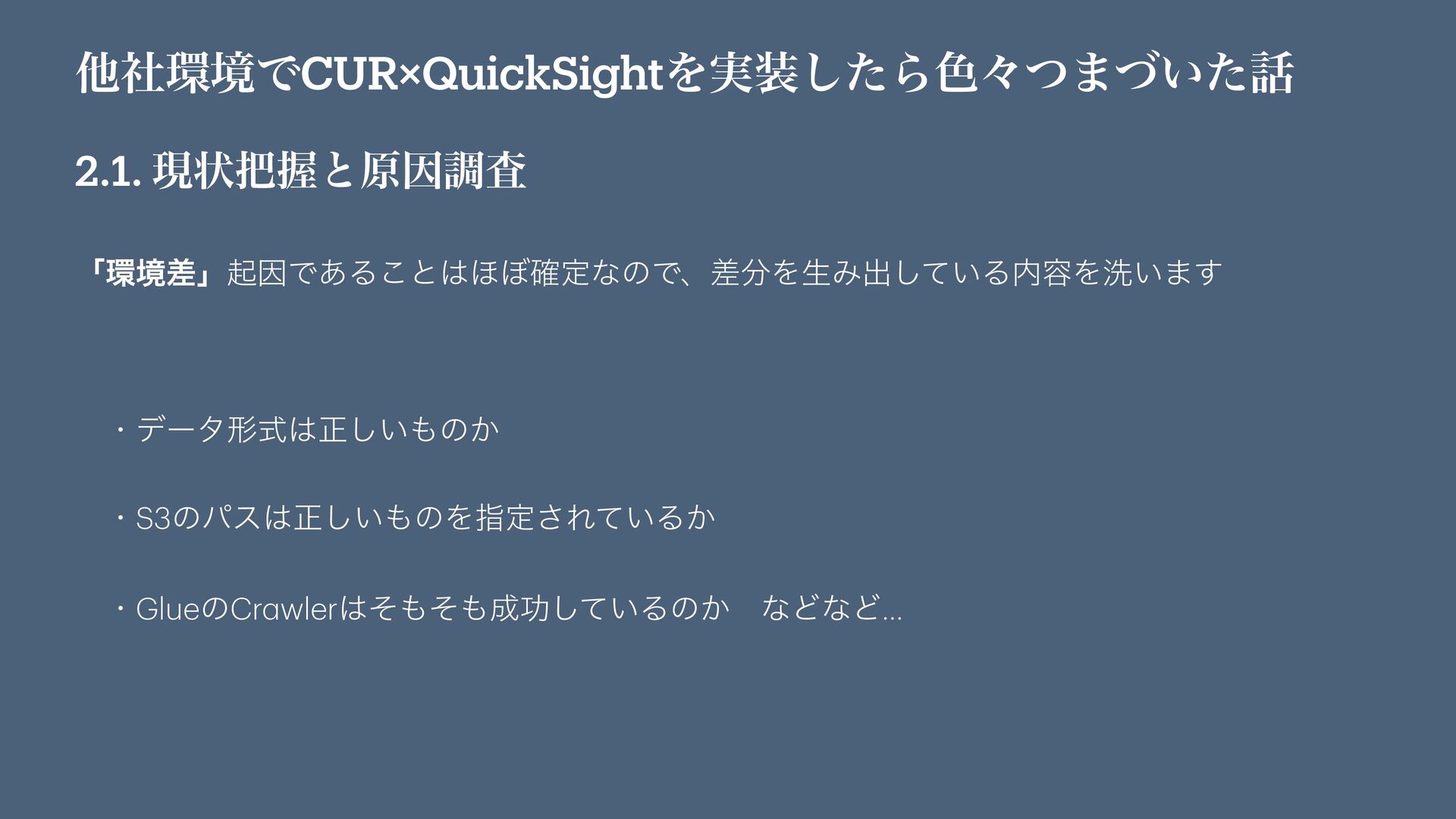 ଞࣾڥͰCUR×QuickSightΛ࣮ͨ͠Β৭ʑͭ·͍ͮͨ 2.1. ݱঢ়ѲͱݪҼௐࠪ ʮڥࠩʯىҼͰ͋Δ͜ͱ΄΅֬ఆͳͷͰɺࠩΛੜΈग़͍ͯ͠Δ༰Λચ͍·͢ ɹɾσʔλܗࣜਖ਼͍͠ͷ͔ ɹɾS3ͷύεਖ਼͍͠ͷΛࢦఆ͞Ε͍ͯΔ͔ ɹɾGlueͷCr a wlerͦͦޭ͍ͯ͠Δͷ͔ɹͳͲͳͲ…