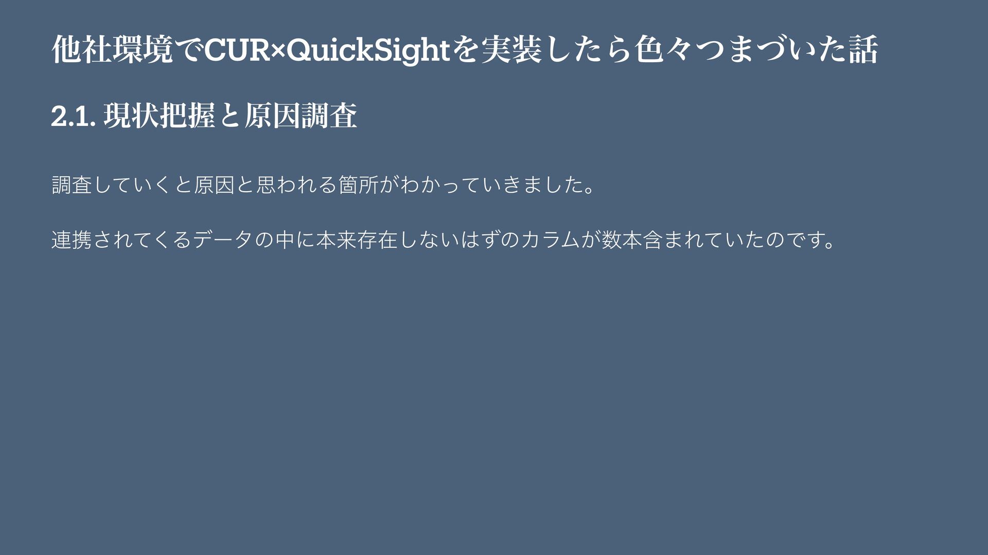 ଞࣾڥͰCUR×QuickSightΛ࣮ͨ͠Β৭ʑͭ·͍ͮͨ 2.1. ݱঢ়ѲͱݪҼௐࠪ ௐ͍ࠪͯ͘͠ͱݪҼͱࢥΘΕΔՕॴ͕Θ͔͍͖ͬͯ·ͨ͠ɻ ࿈ܞ͞Εͯ͘Δσʔλͷதʹຊདྷଘࡏ͠ͳ͍ͣͷΧϥϜ͕ຊؚ·Ε͍ͯͨͷͰ͢ɻ