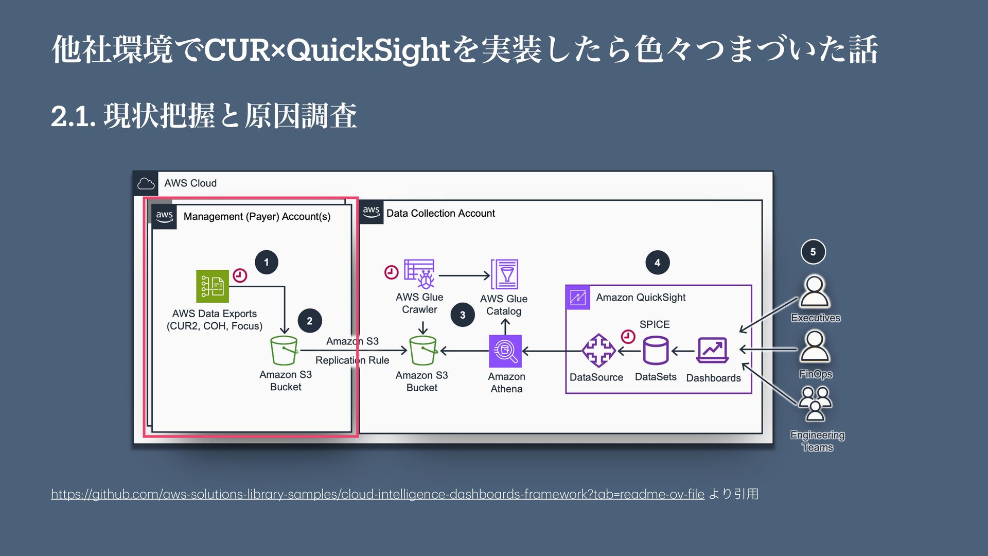 ଞࣾڥͰCUR×QuickSightΛ࣮ͨ͠Β৭ʑͭ·͍ͮͨ 2.1. ݱঢ়ѲͱݪҼௐࠪ https://github.com/ a ws-solutions-libr a ry-s a mples/cloud-intelligence-d