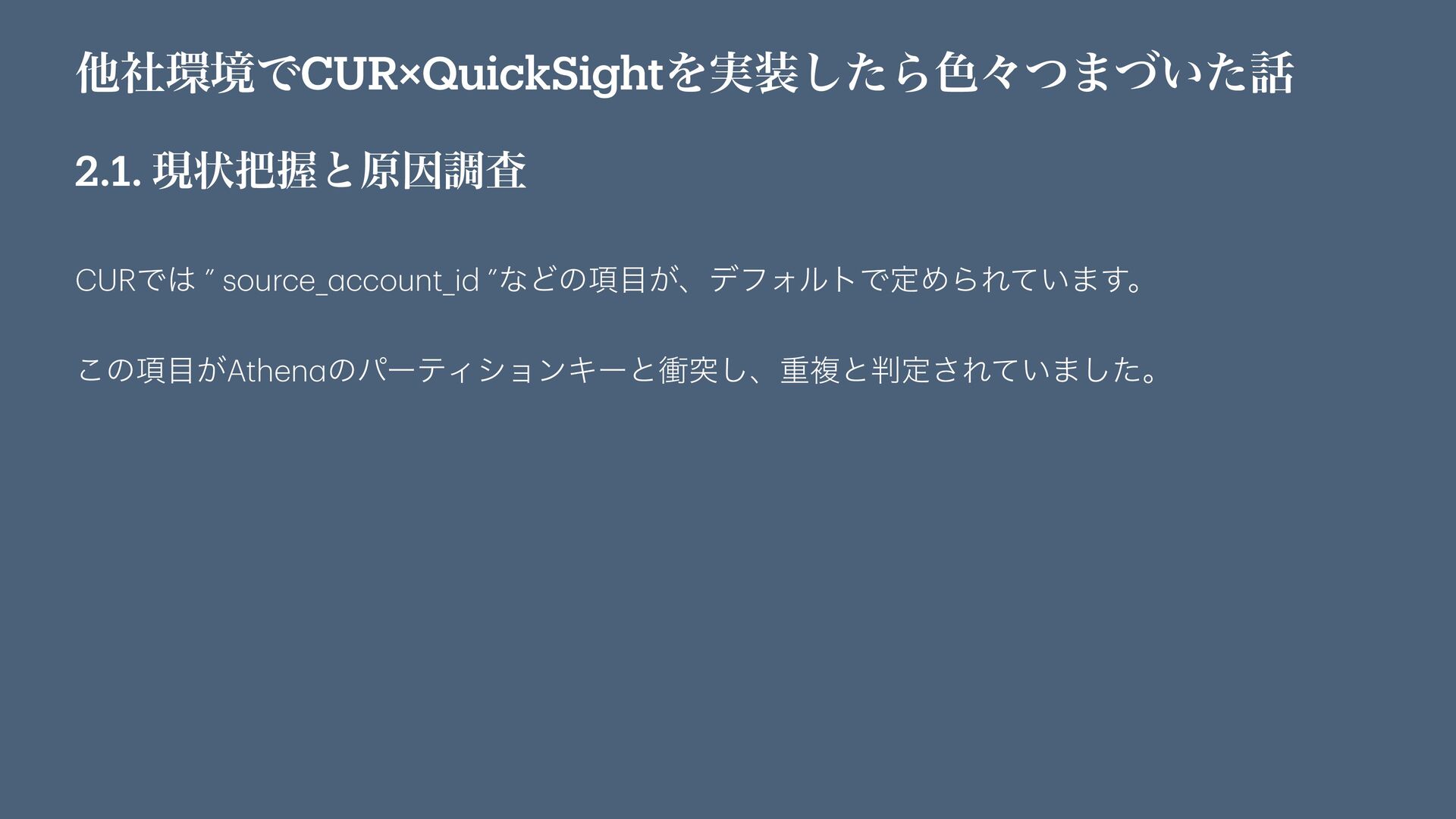 ଞࣾڥͰCUR×QuickSightΛ࣮ͨ͠Β৭ʑͭ·͍ͮͨ 2.1. ݱঢ়ѲͱݪҼௐࠪ CURͰ ” source_ a ccount_id ”ͳͲͷ߲͕ɺσϑΥϧτͰఆΊΒΕ͍ͯ·͢ɻ ͜ͷ߲͕Athen