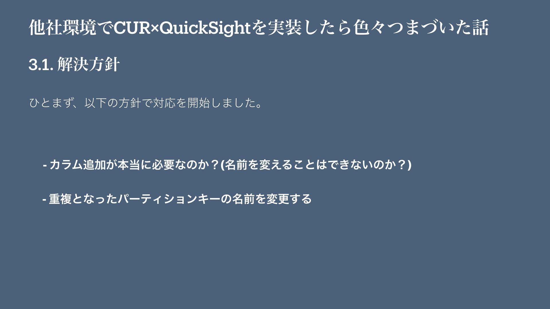 ଞࣾڥͰCUR×QuickSightΛ࣮ͨ͠Β৭ʑͭ·͍ͮͨ 3.1. ղܾํ ͻͱ·ͣɺҎԼͷํͰରԠΛ։࢝͠·ͨ͠ɻ ɹ - ΧϥϜՃ͕ຊʹඞཁͳͷ͔ʁ(໊લΛม͑Δ͜ͱͰ͖ͳ͍ͷ͔ʁ) ɹ - ॏෳͱͳͬͨύʔςΟγϣϯΩʔͷ໊લΛมߋ͢Δ