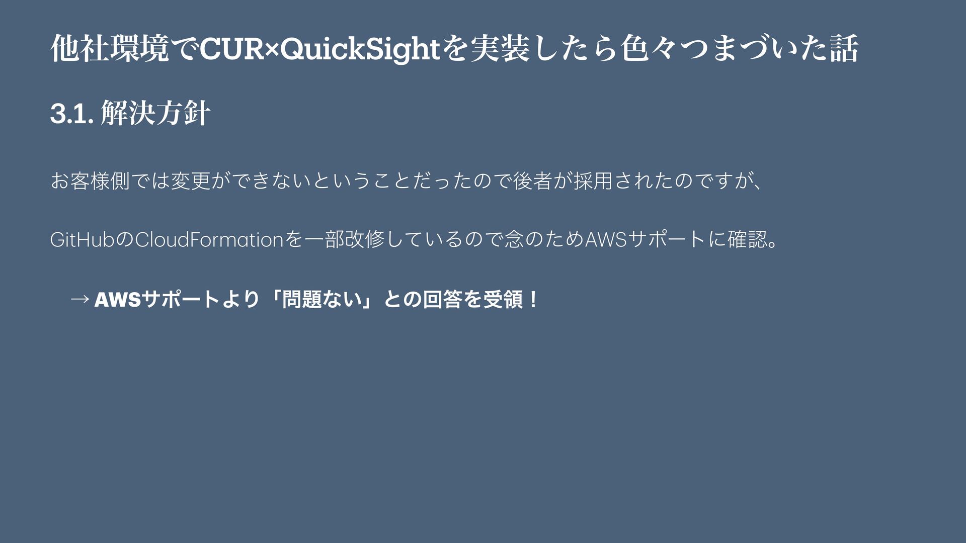 ଞࣾڥͰCUR×QuickSightΛ࣮ͨ͠Β৭ʑͭ·͍ͮͨ 3.1. ղܾํ ͓٬༷ଆͰมߋ͕Ͱ͖ͳ͍ͱ͍͏͜ͱͩͬͨͷͰޙऀ͕࠾༻͞ΕͨͷͰ͕͢ɺ GitHubͷCloudForm a tionΛҰ෦վम͍ͯ͠ΔͷͰ೦ͷͨΊAWSαϙʔτʹ֬ೝɻ ɹˠ AWSαϙʔτΑΓʮͳ͍ʯͱͷճΛडྖʂ