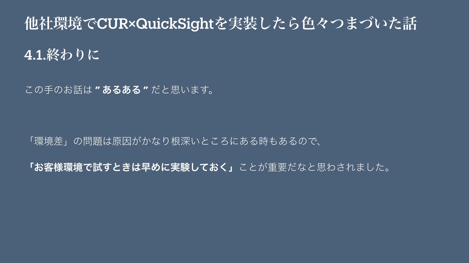 ଞࣾڥͰCUR×QuickSightΛ࣮ͨ͠Β৭ʑͭ·͍ͮͨ 4.1.ऴΘΓʹ ͜ͷखͷ͓ ” ͋Δ͋Δ ” ͩͱࢥ͍·͢ɻ ʮڥࠩʯͷݪҼ͕͔ͳΓࠜਂ͍ͱ͜Ζʹ͋Δ࣌͋ΔͷͰɺ ʮ͓٬༷ڥͰࢼ͢ͱ͖ૣΊʹ࣮ݧ͓ͯ͘͠ʯ͜ͱ͕ॏཁͩͳͱࢥΘ͞Ε·ͨ͠ɻ