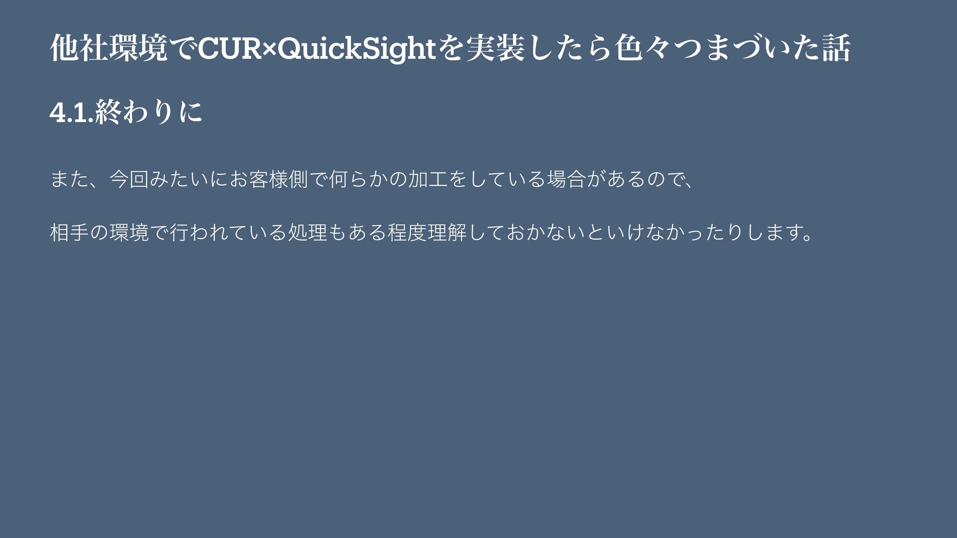 ଞࣾڥͰCUR×QuickSightΛ࣮ͨ͠Β৭ʑͭ·͍ͮͨ 4.1.ऴΘΓʹ ·ͨɺࠓճΈ͍ͨʹ͓٬༷ଆͰԿΒ͔ͷՃΛ͍ͯ͠Δ߹͕͋ΔͷͰɺ ૬खͷڥͰߦΘΕ͍ͯΔॲཧ͋Δఔཧղ͓͔ͯ͠ͳ͍ͱ͍͚ͳ͔ͬͨΓ͠·͢ɻ