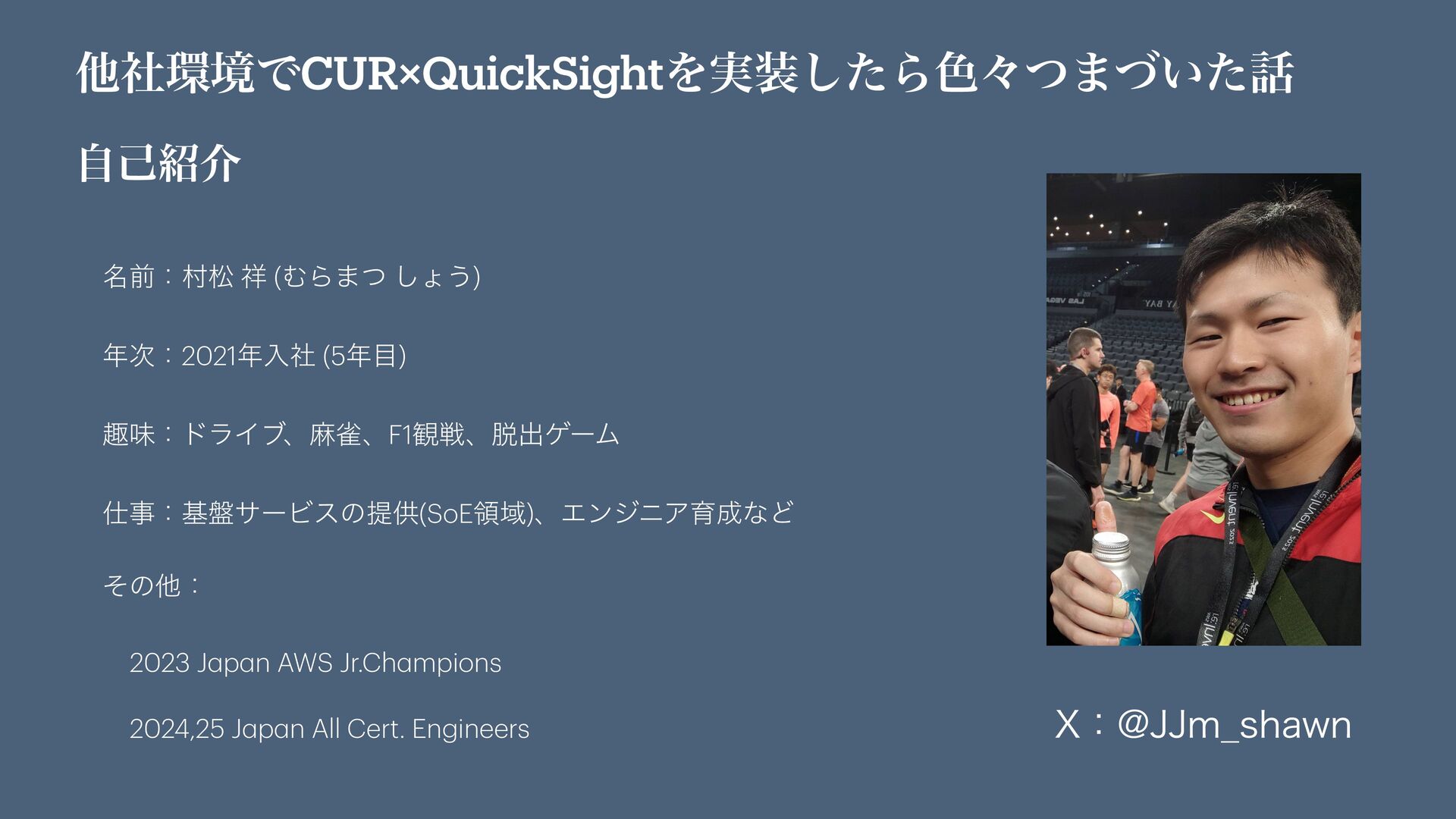 ଞࣾڥͰCUR×QuickSightΛ࣮ͨ͠Β৭ʑͭ·͍ͮͨ ࣗݾհ ໊લɿଜদ (ΉΒ·ͭ ͠ΐ͏) ࣍ɿ2021ೖࣾ (5) झຯɿυϥΠϒɺຑɺF1؍ઓɺग़ήʔϜ ࣄɿج൫αʔϏεͷఏڙ(SoEྖҬ)ɺΤϯδχΞҭͳͲ