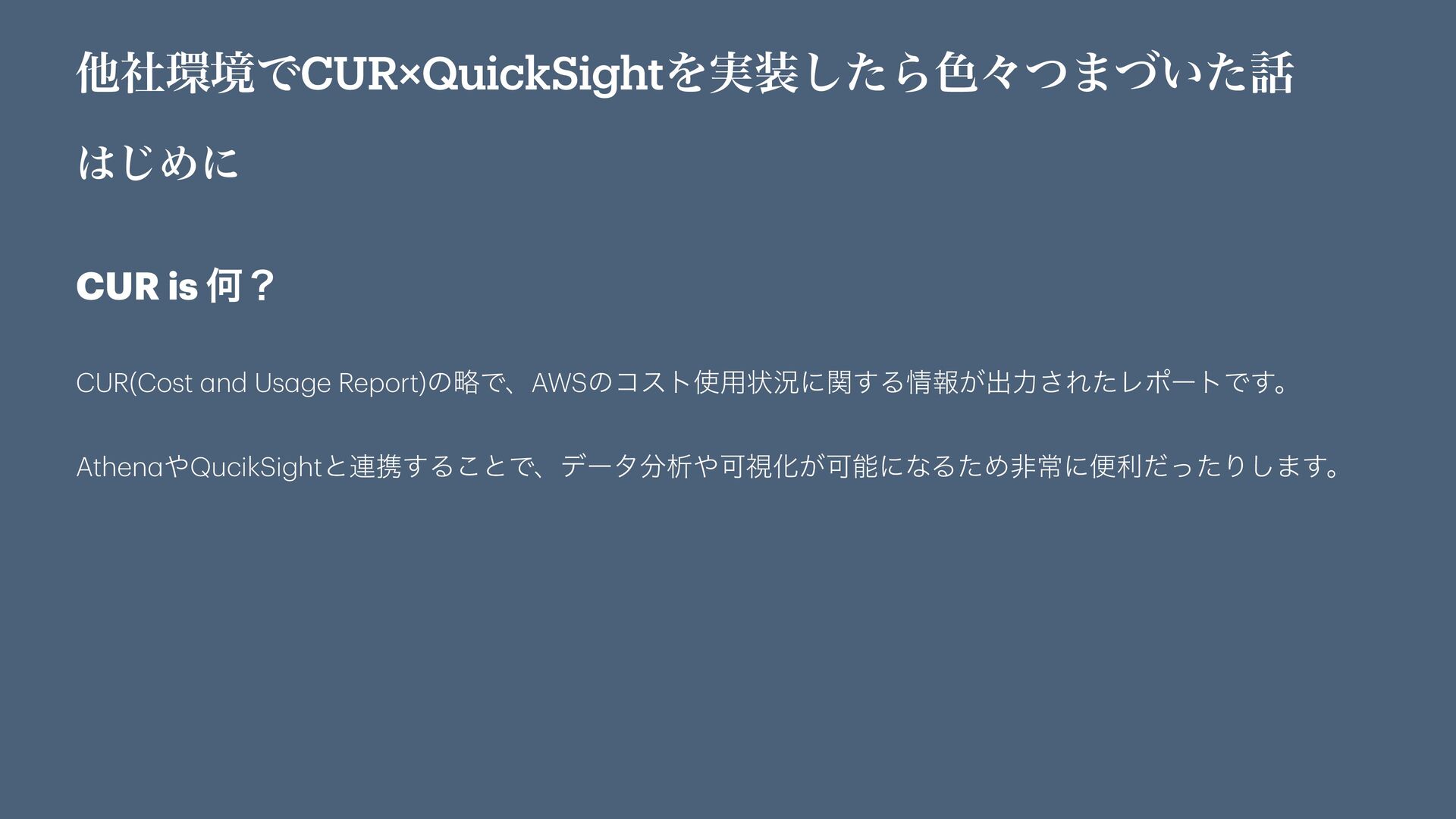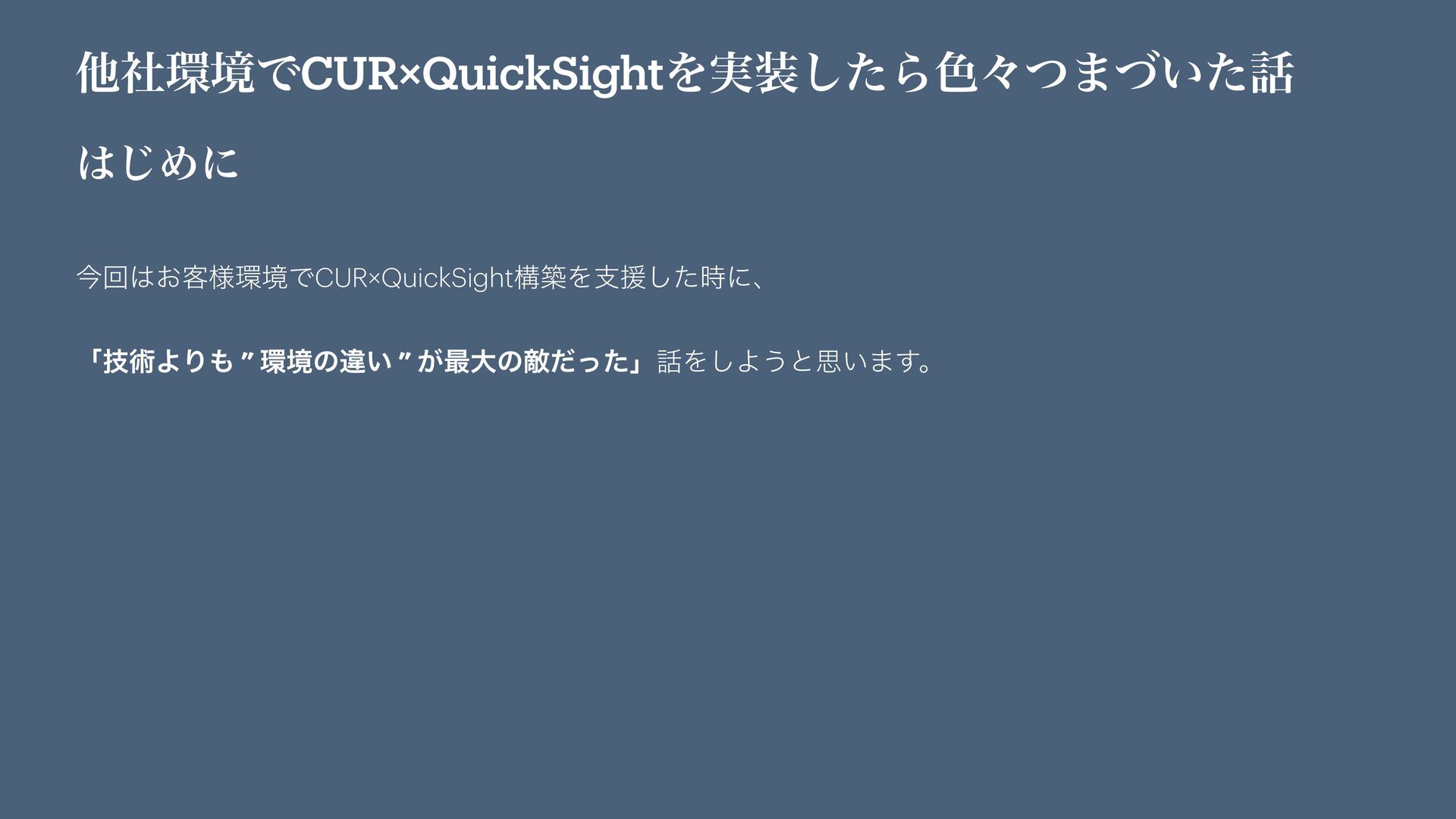 ଞࣾڥͰCUR×QuickSightΛ࣮ͨ͠Β৭ʑͭ·͍ͮͨ ͡Ίʹ ࠓճ͓٬༷ڥͰCUR×QuickSightߏஙΛࢧԉͨ࣌͠ʹɺ ʮٕज़ΑΓ ” ڥͷҧ͍ ” ͕࠷େͷఢͩͬͨʯΛ͠Α͏ͱࢥ͍·͢ɻ