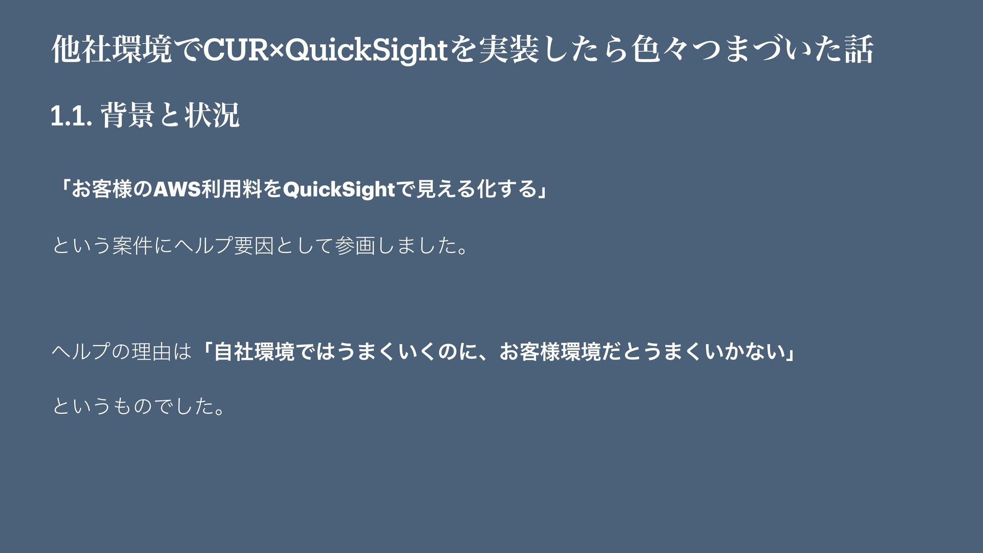ଞࣾڥͰCUR×QuickSightΛ࣮ͨ͠Β৭ʑͭ·͍ͮͨ 1.1. എܠͱঢ়گ ʮ͓٬༷ͷAWSར༻ྉΛQuickSightͰݟ͑ΔԽ͢Δʯ ͱ͍͏Ҋ݅ʹϔϧϓཁҼͱͯ͠ࢀը͠·ͨ͠ɻ ϔϧϓͷཧ༝ʮࣗࣾڥͰ͏·͍͘͘ͷʹɺ͓٬༷ڥͩͱ͏·͍͔͘ͳ͍ʯ ͱ͍͏ͷͰͨ͠ɻ