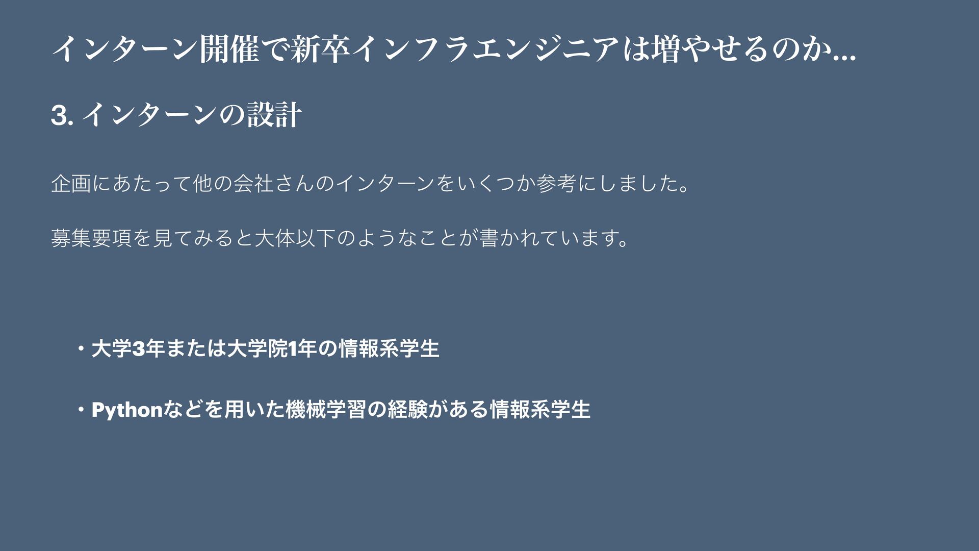 Πϯλʔϯ։࠵Ͱ৽ଔΠϯϑϥΤϯδχΞ૿ͤΔͷ͔… 3. Πϯλʔϯͷઃܭ اըʹ͋ͨͬͯଞͷձࣾ͞ΜͷΠϯλʔϯΛ͍͔ͭ͘ࢀߟʹ͠·ͨ͠ɻ ืूཁ߲ΛݟͯΈΔͱେମҎԼͷΑ͏ͳ͜ͱ͕ॻ͔Ε͍ͯ·͢ɻ ɹɾେֶ3·ͨେֶӃ1ͷใܥֶੜ ɹɾPythonͳͲΛ༻͍ͨػցֶशͷܦݧ͕͋Δใܥֶੜ