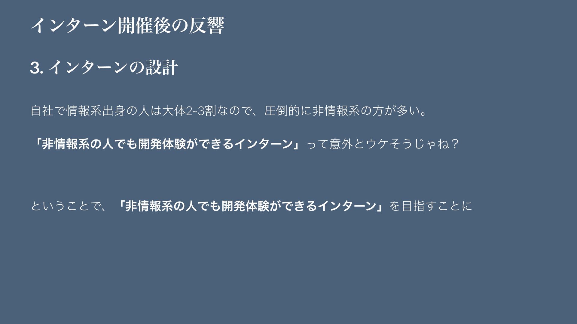ࣗࣾͰใܥग़ͷਓେମ2~3ׂͳͷͰɺѹతʹඇใܥͷํ͕ଟ͍ɻ ʮඇใܥͷਓͰ։ൃମݧ͕Ͱ͖ΔΠϯλʔϯʯͬͯҙ֎ͱέͦ͏͡ΌͶʁ ͱ͍͏͜ͱͰɺʮඇใܥͷਓͰ։ൃମݧ͕Ͱ͖ΔΠϯλʔϯʯΛࢦ͢͜ͱʹ Πϯλʔϯ։࠵ޙͷڹ 3. Πϯλʔϯͷઃܭ