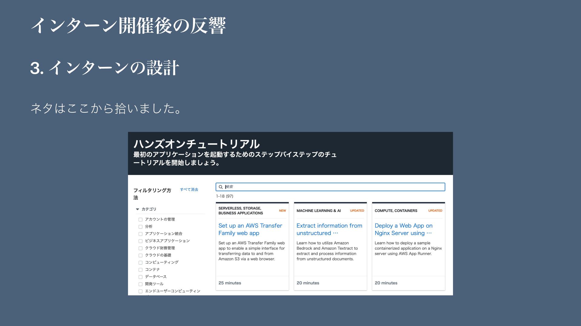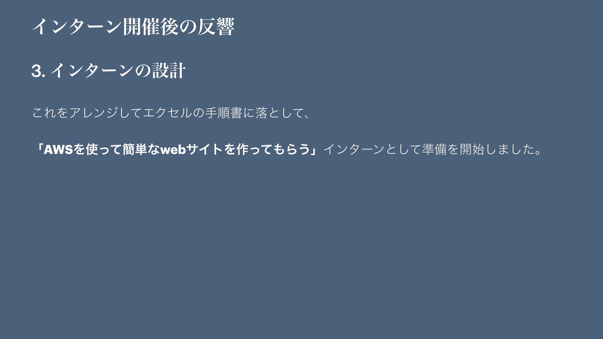 ͜ΕΛΞϨϯδͯ͠ΤΫηϧͷखॱॻʹམͱͯ͠ɺ ʮAWSΛͬͯ؆୯ͳwebαΠτΛ࡞ͬͯΒ͏ʯΠϯλʔϯͱͯ͠४උΛ։࢝͠·ͨ͠ɻ Πϯλʔϯ։࠵ޙͷڹ 3. Πϯλʔϯͷઃܭ